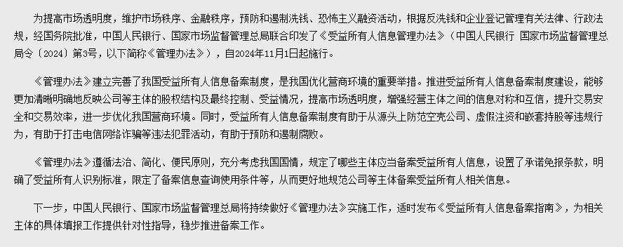 中国人民银行 国家市场监督管理总局联合发布《受益所有人信息管理办法》