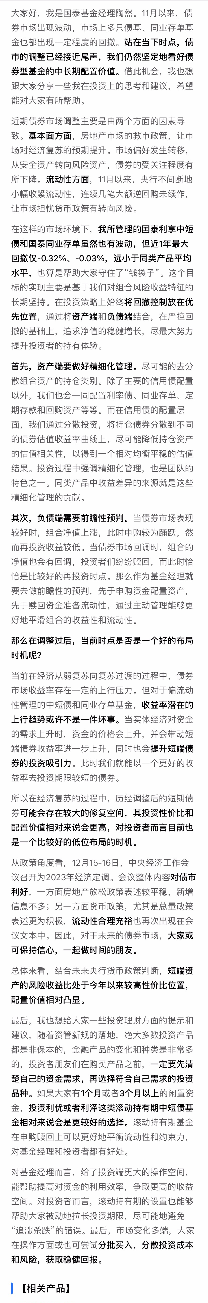 | 国泰利享中短债债券C | 19.99% | 较低 | 元起购 |