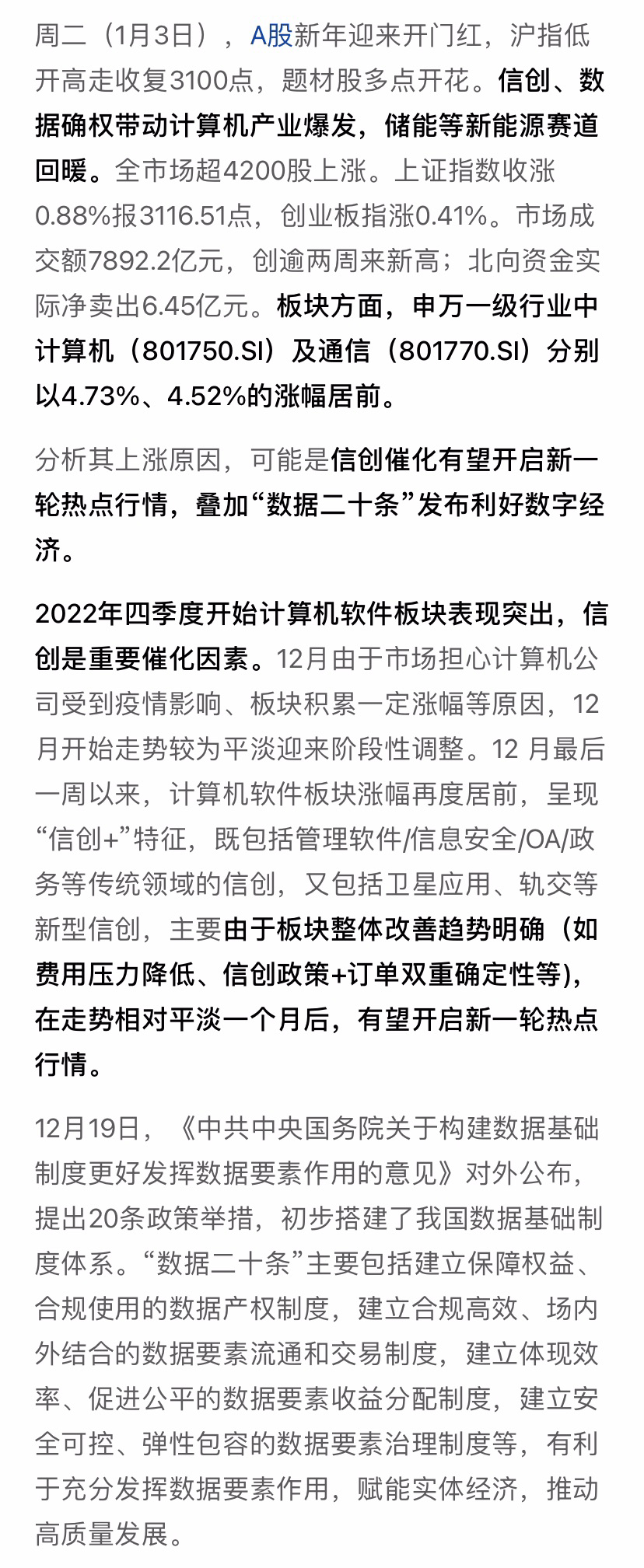 【异动点评】A股新年开门红,信创催化新一轮热点行情