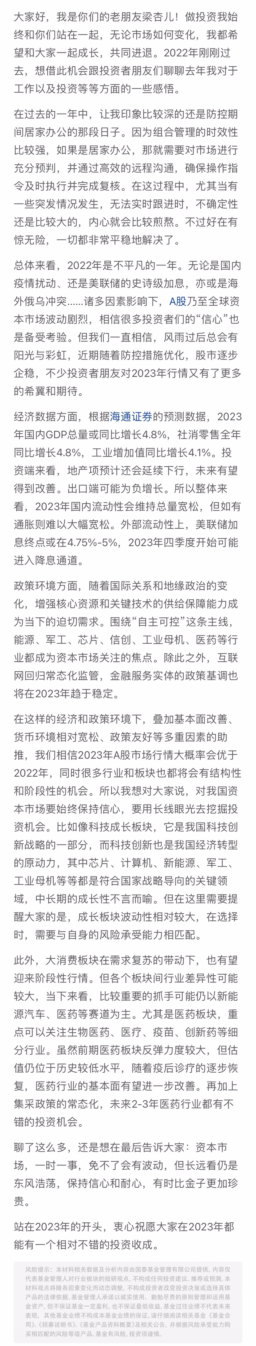 【国泰基金梁杏】至投资者的一封信:未来长期向好,保持信心比金子更珍贵