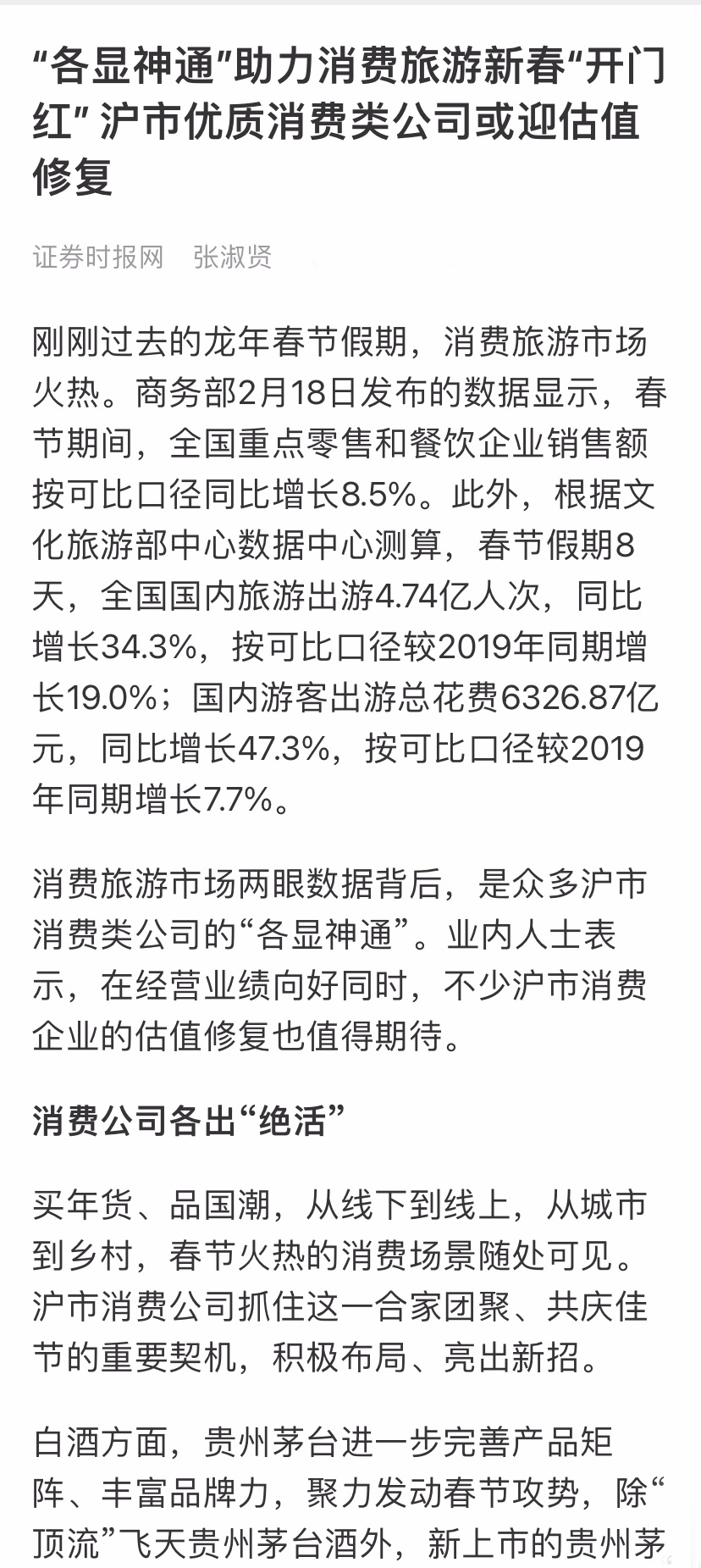 “各显神通”助力消费旅游新春“开门红” 沪市优质消费类公司或迎估值修复