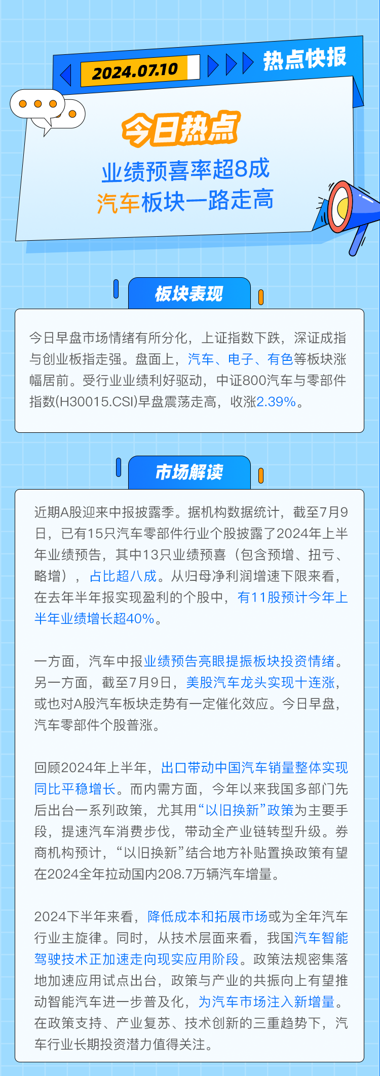 【热点快报】业绩预喜率超8成,汽车板块一路走高