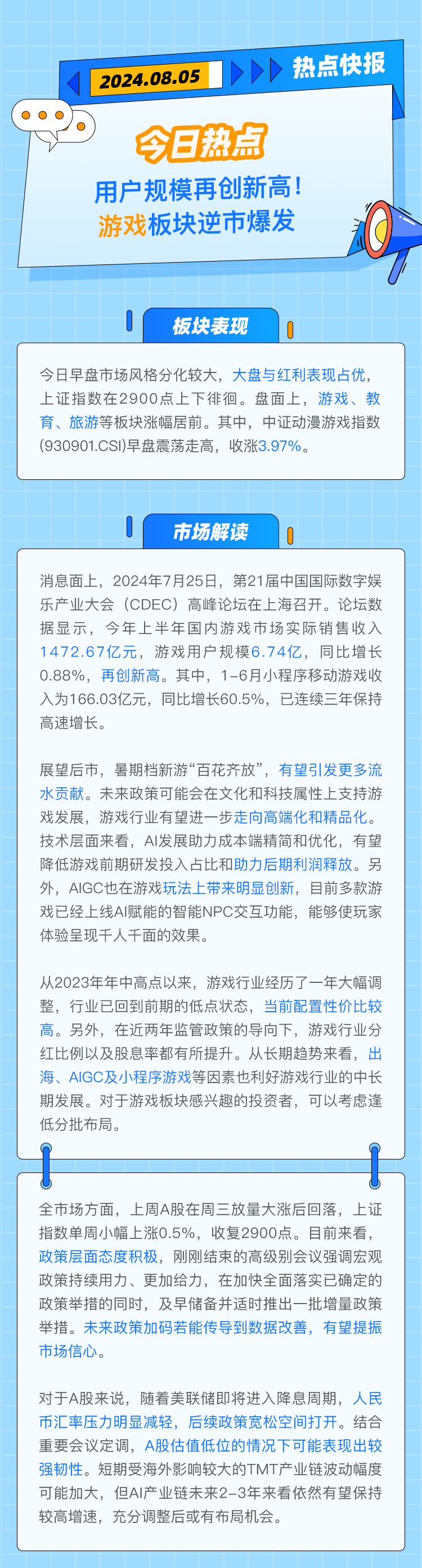 【热点快报】用户规模再创新高!游戏板块逆市爆发