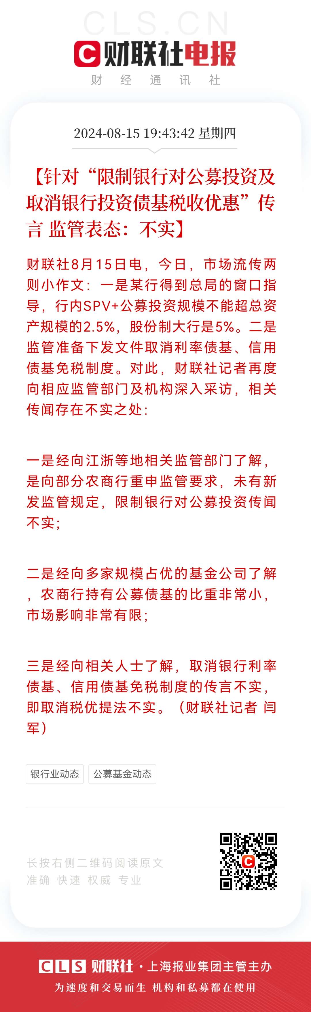 针对“限制银行对公募投资及取消银行投资债其税收优惠”传言 监管表态:不实