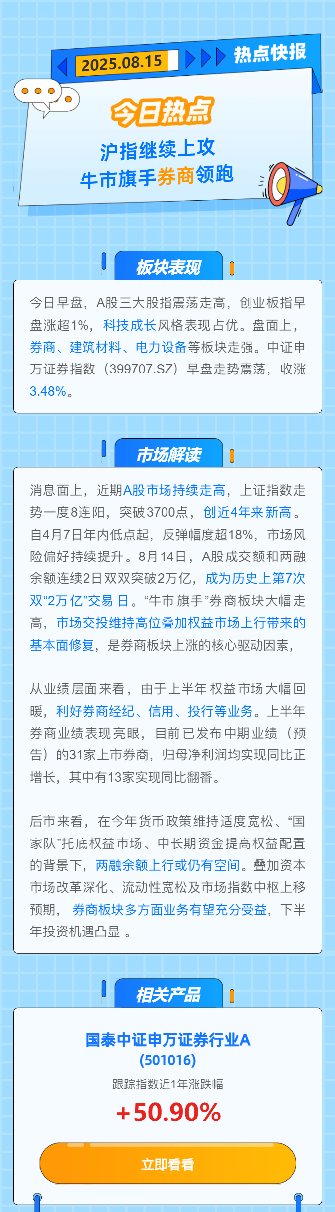【热点快报】沪指继续上攻 牛市旗手券商领跑