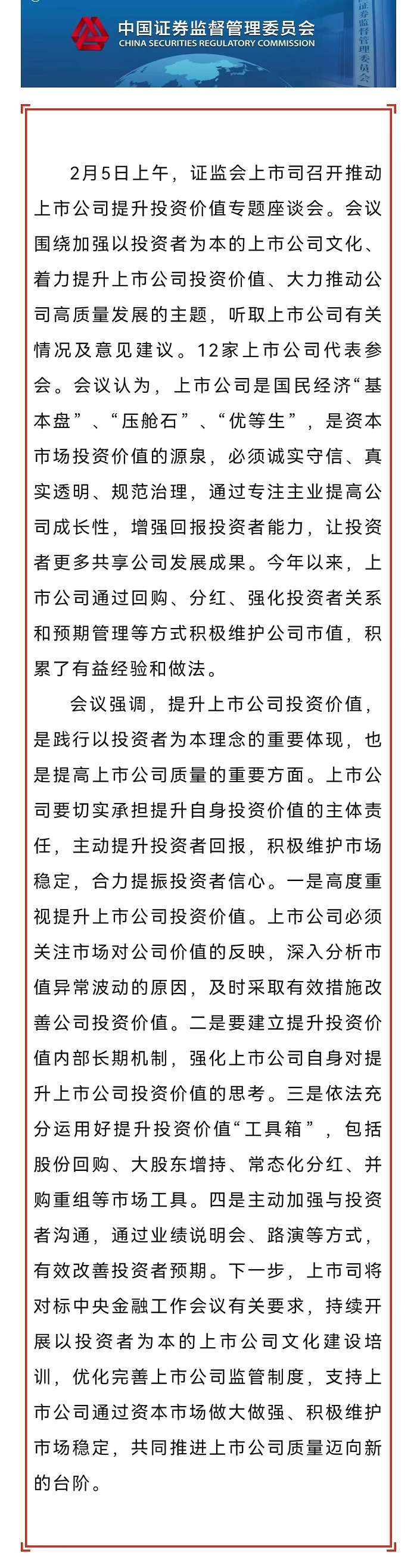 证监会召开推动上市公司提升投资价值专题座谈会
