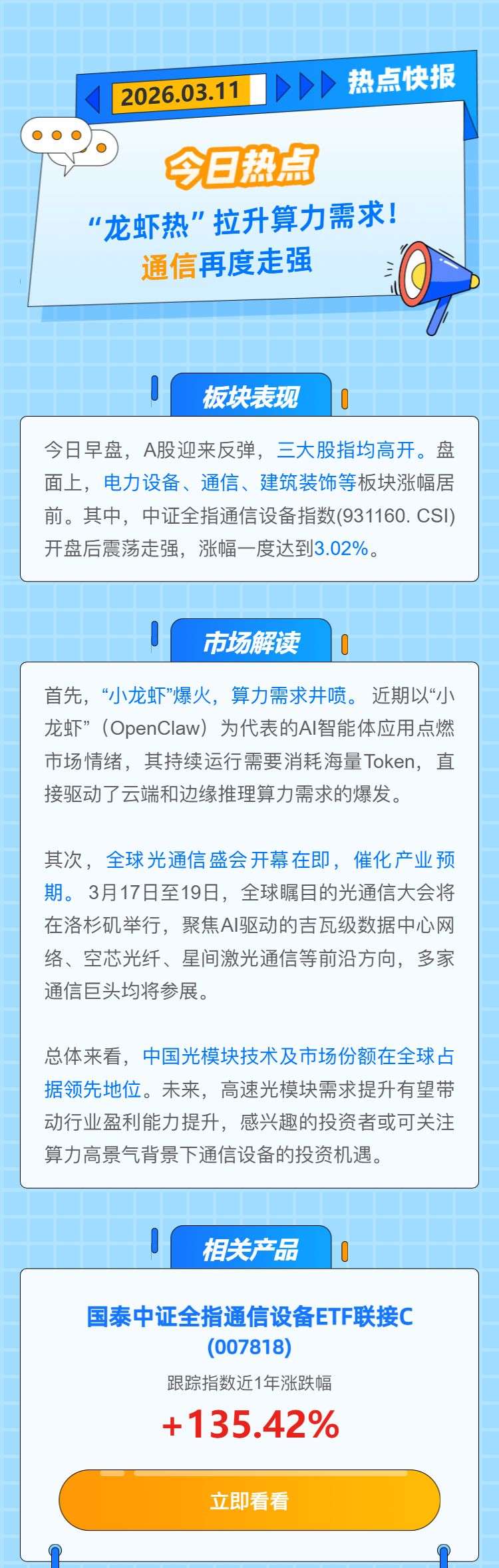 【热点快报】“龙虾热”拉升算力需求! 通信再度走强