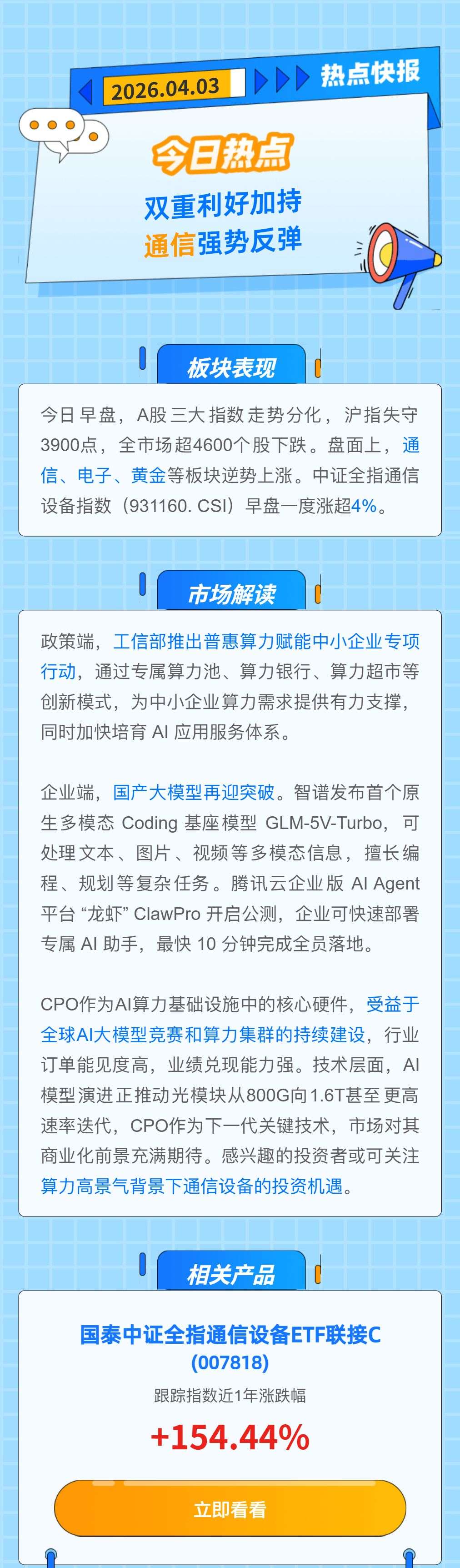 【热点快报】双重利好加持 通信强势反弹
