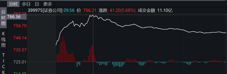 今日早盘,证券板块强势领涨,中证全指证券公司(399975.SZ)指数盘中一度涨超5%!