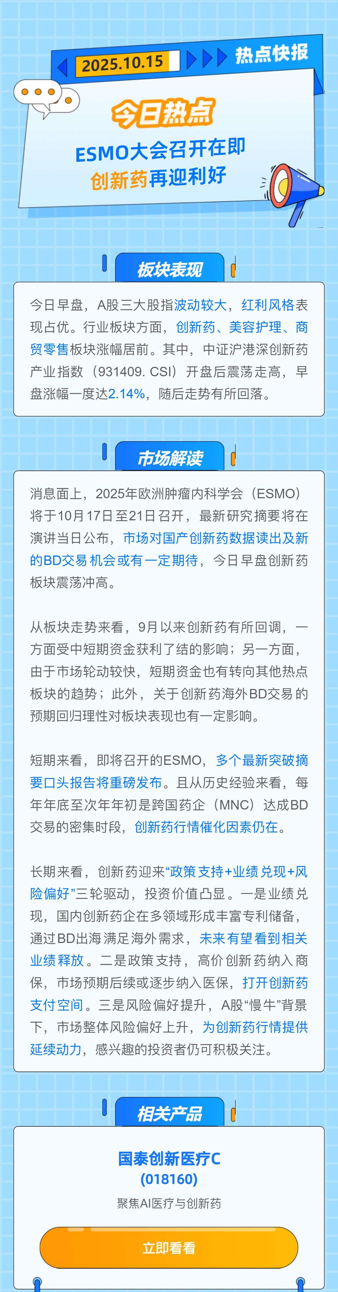 【热点快报】ESMO大会召开在即 创新药再迎利好