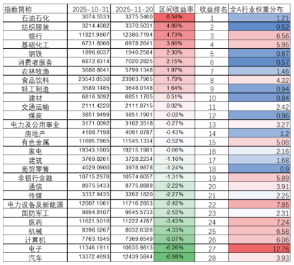 此外,从市场结构上看,今日的明显回调也在一定程度上反映了前期结构性涨幅积累后的集中消化。今年以来部分行业在持续上行过程中逐步积累了较为可观的涨幅,其在指数中的权重占比也随之有所抬升。进入本月以来(截至11月20日,不含11月21日大幅波动),这些前期表现较为突出的高权重板块陆续进入整理阶段,对指数形成了一定的阶段性扰动。在此背景下,万得全A指数仅回调1.87%,主要得益于部分小权重行业的阶段性走强,对指数起到了缓冲和托举作用。不过,从结构特征来看,小权重行业多数以低波动、偏价值风格为主,其弹性和资金承载能力相对有限,随着前期高权重(涨幅较高)板块加速消化风险,小权重板块的支撑效应亦逐步趋于平缓。短期内指数出现一定回吐,更可理解为对前期结构性涨幅的自然消化与再平衡过程,属于市场运行中的正常节奏调整。